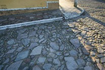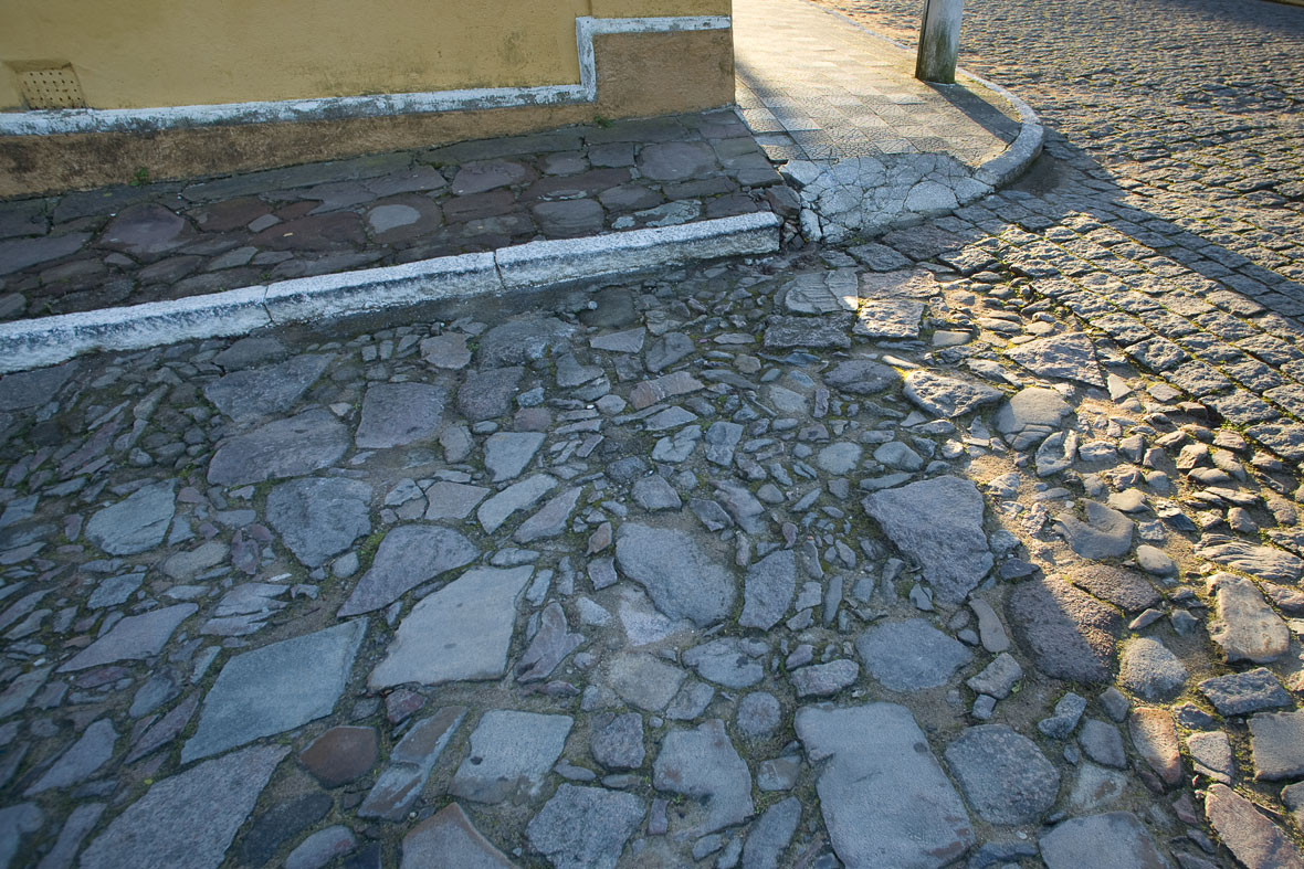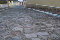 Remaining extent of the old pavement composed of irregular granite stones of several sizes. Sidewalks include parts with similar pavement.