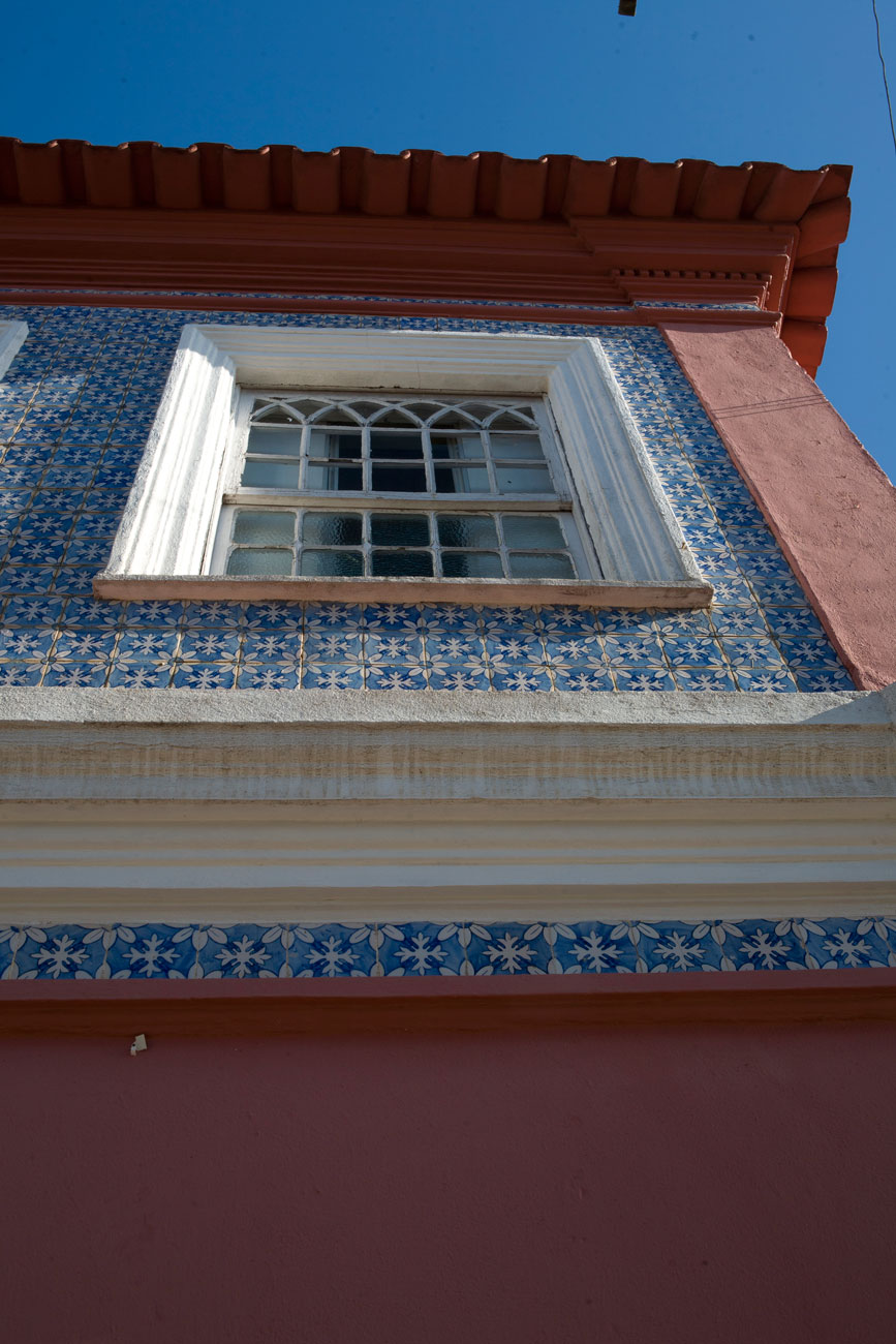 This edifice has its superior façade covered in ceramic tilework, probably from Portugal. The corners are marked by vertical and horizontal cornice. It also displays a flat front and frieze tile.
